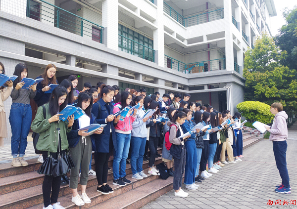 本网讯 为响应学校“强化外语语言训练,提升外语运用能力”的号召,进一步推动“随时随地学外语、讲外语、用外语”工作,让学生能够掌握更地道的发音,西方语言文化学院“外教带领户外晨读”活动持续有序地开展,并且对户外晨读模式进行了创新。