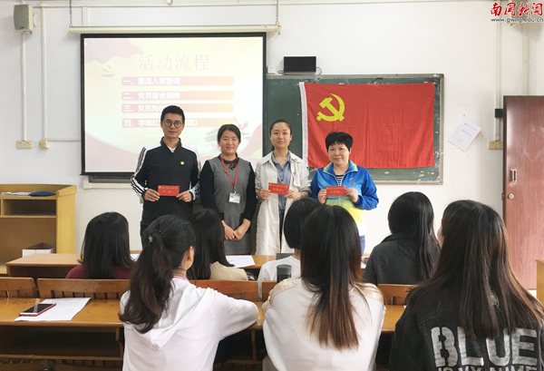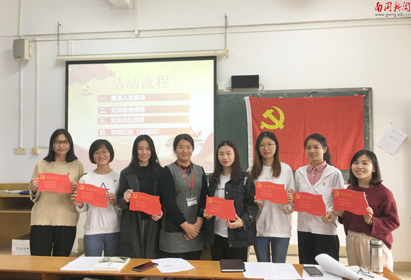 为了增强党员的归属感和对共产党员政治身份的认同感。英文学院在学生党员宿舍挂牌、行政教工党员设立示范岗,亮明党员身份,牢记党员职责,主动接受群众监督。支部还全面推行党员佩戴党徽,每周一日戴党徽活动;推行党员“政治生日”制度,即向党员发送入党纪念日电子贺卡。在支部健全党内组织生活,让党员亮身份、亮承诺、亮职责,强化行使党员权利、履行党员义务的自觉性。支部也建立党建工作微信群,覆盖支部全体党员,加强党员教育管理,让党员时时铭记党员身份,处处增强党员意识,自觉做到在党言党、在党忧党、在党为党。