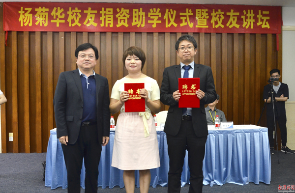 本网讯 4月19日下午,校友助学金捐赠仪式在C202举行。2008级日语专业校友、香港华成电子有限公司总经理杨菊华回校捐赠助学金2万元,资助4名家境贫困且品学兼优的学生完成学业。