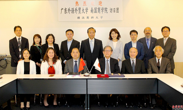 15日,访日团赴爱知东邦大学交流访问,与该校董事长榊直树共同为“广东外语外贸大学南国商学院日本实习基地”揭牌,这是我校在日本创建的第一个实习基地,将为我校师生提供更多赴日交流的机会。访日团与该校副校长若林努等展开会谈,双方共同表达了要继续推动两校更广更深层次合作交流的意愿,提出了互派教职工交流学习的设想。