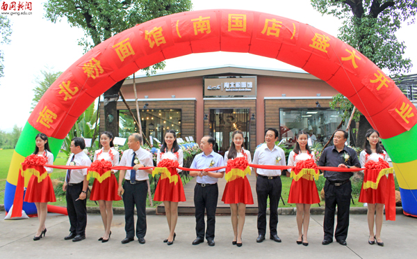 本网讯 6月9日上午,南北粉面馆(南国店)开业仪式在学校文化广场举行。我校董事长丁小军,党委书记、副校长黎冬,常务副校长赖志立,副校长何艾兵、杨永强、熊匡汉,党委副书记付鸿信,广州市从一品餐饮管理有限公司总经理赵爱党、副总经理甘靖杰出席开业仪式。