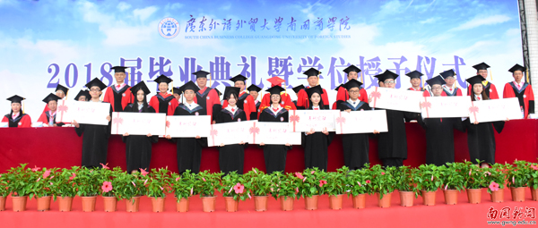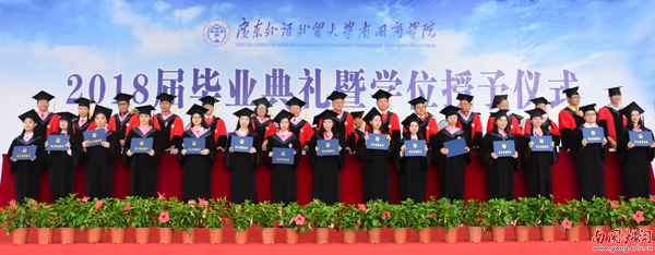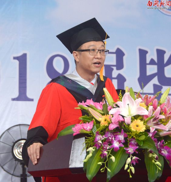 焦方太致辞,他代表学校向2018届全体毕业生致以最热烈的祝贺和最衷心的祝福。他说:“大学四年时光,同学们用最美年华铸造着青春活力的南国,用成长成才成就着欣欣向荣的南国。”他还表示,同学们也见证了学校奋力向前的足迹。第二期校建蓄势待发,如山水画卷的优美环境为师生提供了良好的学习与生活环境;学科建设取得重大成果,英语语言文学、国际贸易学两个学科获批省级特色重点学科。省级空港经济协同创新中心,国家级极地问题研究中心相继挂牌并取得良好进展,学校的成长更是学生的成长。