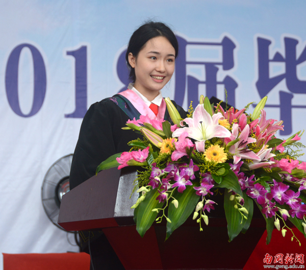 2014级汉语言文学(新闻采编)专业的钟佳利作为毕业生代表发言。她回忆起大学生活难忘的点滴,她以一首诗感恩母校,感恩师长。“轻轻地我们走了,正如我们轻轻地来,我们轻轻地挥手,作别南国的云彩。撑一支信心的长篙,满载一路收获,在十三五的星辉里放歌,共同编织彩虹式的南国梦!别离的笙箫响起,轻轻地向各位老师道声感谢,珍重!向同学们道声,撸起袖子,加油干!勿忘初心,继续前行!”