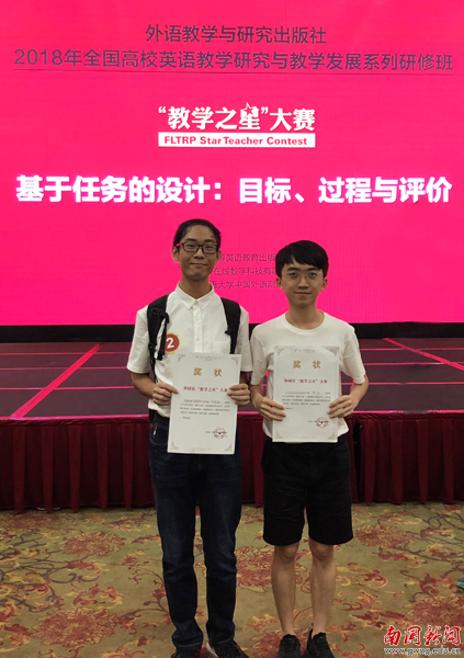 本网讯 近日,2018外研社杯“教学之星”比赛复赛在成都举行,我校大学英语教学部何梓健、莫浩两位教师分别荣获本次大赛的亚军和季军。