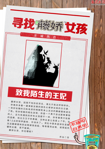 本网讯 暑假期间,第十届全国大学生广告艺术大赛广东赛区和全国总决赛相继决出赛果。管理学院陈柱君同学为音乐歌曲《代日拉查》创作的平面广告《此番天地有彼方惊喜》和陈蓝月、梁婷婷同学为方便面品牌创作的系列平面广告《寻找藤娇女孩》获得广东省赛区三等奖,并在随后的全国总决赛中获得优秀奖。