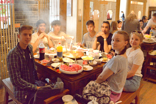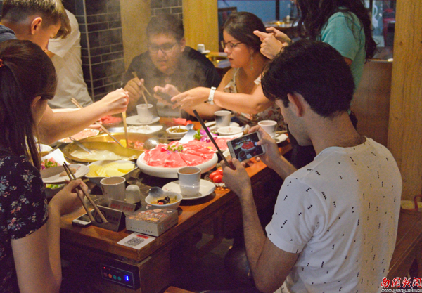 俄罗斯和墨西哥的留学生在吃火锅的过程中遇上了小小的难题,相较于韩国留学生使用筷子的轻车熟路,俄罗斯和墨西哥的留学生就显得有些不自信了,急忙寻找同桌的中国同学学习筷子使用方法,临阵磨枪。韩国留学生马俊熙表示,这是他第二次吃火锅,相比第一次与中国朋友在北京路吃的火锅,这次的火锅更加的火辣,他非常喜欢。
