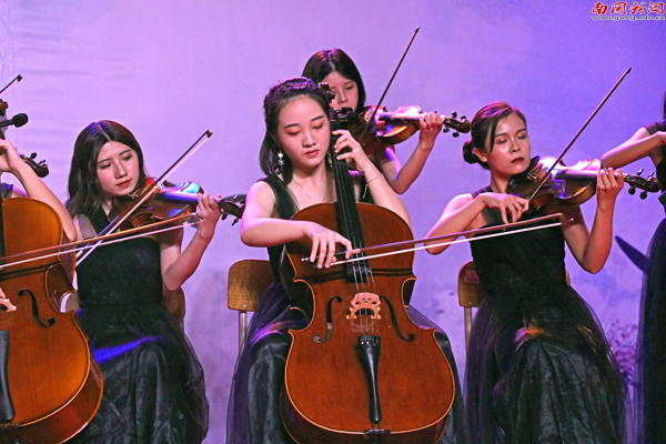 一束舞台灯光洒下舞台,竹笛、电钢琴、吉他和二胡齐齐奏响,中文学院带来的乐器合奏《年轮》,悠扬的笛声与琴声此起彼伏,时不时还传来非洲鼓极具节奏感的鼓声,悲伤与宁静的旋律更是扣人心弦,每一个音符都在诉说着圈圈年轮代表的层层思念。