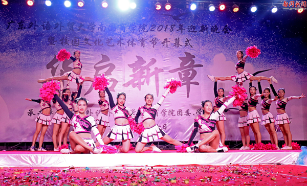 校啦啦队以开场舞“Saturday”揭开了晚会序幕,挥舞着彩球的舞者热情万分、默契十足,点燃了现场的气氛。她们以动感的舞姿展现青春的靓丽风采。