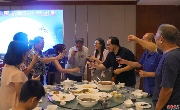 赖志立代表学校向在座的教授、向全校教职员工及其亲属表达了节日的问候。中秋万家团聚之时,教授们坚守在学校,坚持融入南国商学院这个大家庭,这体现出各位教授、各位教职员工为学校发展争作贡献的信心和决心。走进南国门,我们就是一家人。今晚,是亲情的表达,是家人的聚会。学校发展越来越好,南国大家庭也越来越好。
