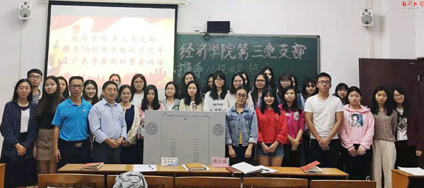 又讯 10月31日晚,经济学院第三党支部组织师生在E503就习近平总书记视察广东重要讲话精神学习并展开讨论。经济学院全体党员和2016级税收学专业学生参加了本次会议。