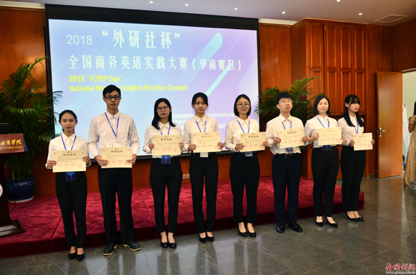 2018“外研社杯”全国商务英语实践大赛华南赛区初赛共有17所高校31只队伍参赛。最终有8支队伍通过初赛,获得本次华南赛区区域赛资格。这8支队伍分别是广东财经大学 Joymaker队、广东技术师范学院 Cocoonerfly队、广东外语外贸大学南国商学院 Dream Chaser队、华南农业大学 Bubble Tea队、惠州学院 Triple C、吉林大学珠海学院 Balance队、暨南大学 Voyager队和中山大学新华学院 Whirlpool队。2018“‘外研社杯’全国商务英语实践大赛”继承了往届大赛“理论与实践相结合”以及“商为我专,英系我才”的特点,旨在培养学生商务英语沟通能力,提高学生商务知识与实践技能相结合的素质,促进高校全英商务课程理论和实践相结合,鼓励当代大学生立足企业和社会的可持续性发展,关注社会热点问题,激发大学生创新思维,激励大学生努力成长为学以致用、回馈社会的国际复合型商务精英人才。大赛分初赛、区域赛、全国晋级赛和全国总决赛,我校首次承办华南赛区的区域赛,出色的组织工作,受到了与会代表和嘉宾的一致好评。