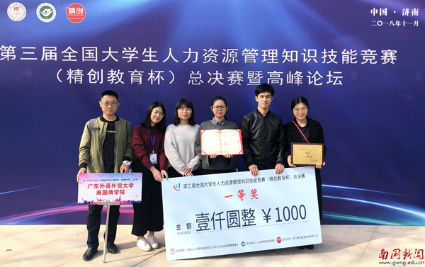 本网讯 11月3日至4日,第三届全国大学生人力资源管理知识技能竞赛总决赛(精创教育杯)暨高峰论坛在山东举办,我校2016级人力资源专业学生刘浩天、刘昕怡、戴维、陈敏娜组成的团队斩获一等奖。
