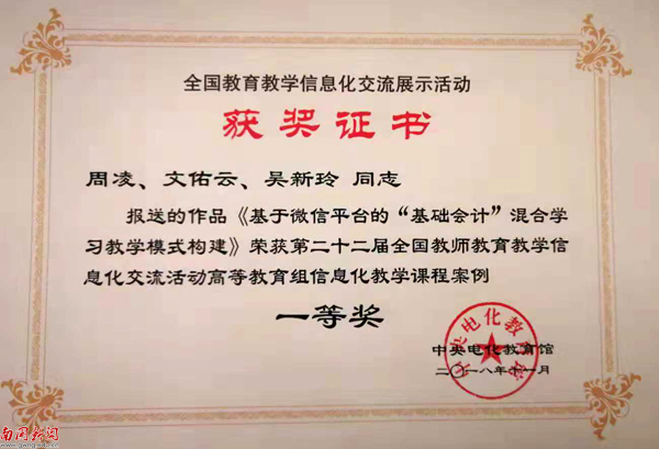 本网讯 近日,由中央电化教育馆主办的第二十二届全国教育教学信息化交流展示活动现场决赛在青岛落下帷幕,我校周凌教授团队报送的信息化教学课程案例作品《基于微信平台的“基础会计”混合学习教学模式构建》荣获一等奖。