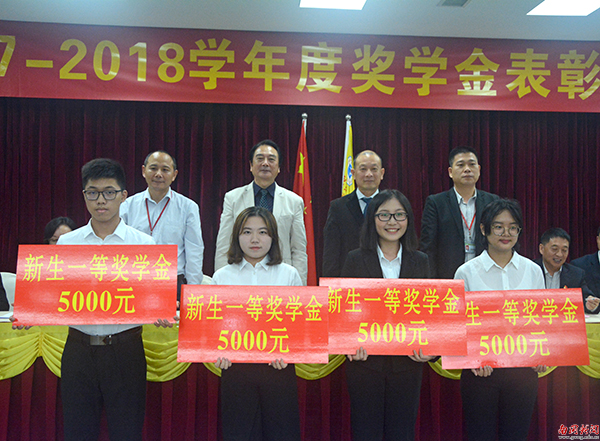 校领导、老师为校一等奖学金获得者颁发荣誉证书 (邓浩谋 摄)
