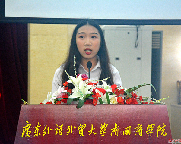 国家奖学金获得者、2015级法语2班的孙杏燕作为学生代表发言。她认为,大学期间制定计划真的很重要,“凡事预则立,不预则废”,但是计划并不是天马行空的空想,而是切乎实际的规划,坚持更是成功的关键。“多少人立下誓言却在第二日抛之脑后?”大二那年,法语发音不够标准的孙杏燕获得了去到广外学习的机会,她明白自己的弱点,所以一直坚持6:30起床晨读,她以切身的经历告诉同学们坚持的重要性。“站在起点的时候,人与人的差别在于选择;到了终点的时候,人与人的差别在于坚持”。