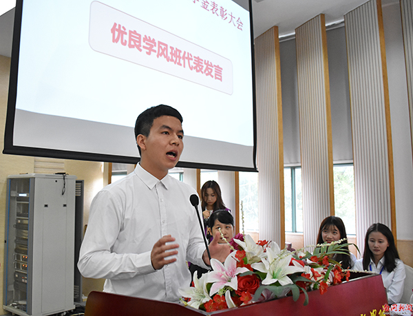 来自2017级国贸双语班的张润泉作为2018年“优良学风班”荣誉称号获得班级代表上台发言。他从学风建设、新媒体运营、班级活动、社会实践等四个方面向在座学生分享了优秀班级构建的经验。他表示,优秀班级的建设需要大家在学习上互帮互助,在班级活动中积极参加,在社会实践中“聚如团火,散如群星”,这样才能增强班级的凝聚力,构建一个温暖的班集体。