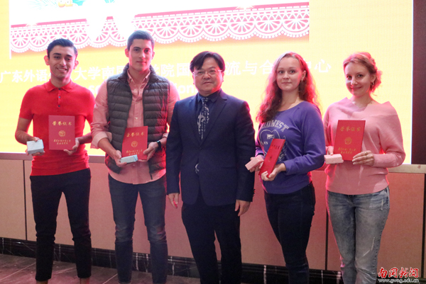 开席前,常务副校长赖志立对外籍教师一年的辛勤付出表示衷心感谢,并为4位优秀交换生颁发了荣誉证书,他祝愿外籍教师在2019年的教学工作中能取得更优异的成绩,国际学生们能够学业进步、学有所成。席间,学校为外教和留学生赠送新年礼物——具有广东特色的点心鸡仔饼。