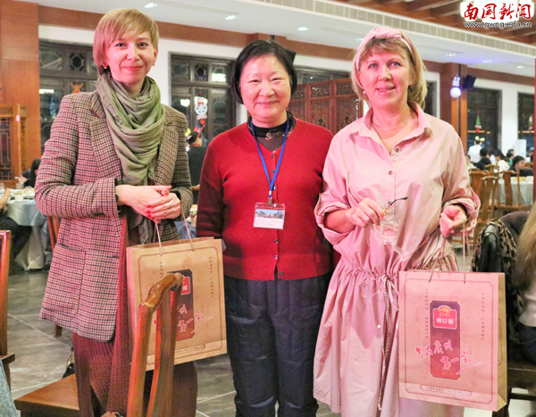 收到礼物的俄罗斯外教Irina Militsina十分兴奋,抱着鸡仔饼与同桌老师说道:“这份礼物真是太棒了,我要带回去与我的家人分享!”同样来自俄罗斯的外教卡佳来到中国已经有3年了,她表示,晚宴很美味,有俄罗斯家宴的感觉,她尤其钟爱白灼虾。“在俄罗斯,新年的时候,我们也会聚在一起吃饭,准备俄罗斯沙拉、点心等等,还会在新年倒计时,倒满香槟,酌饮之时许下新年的愿望。”
