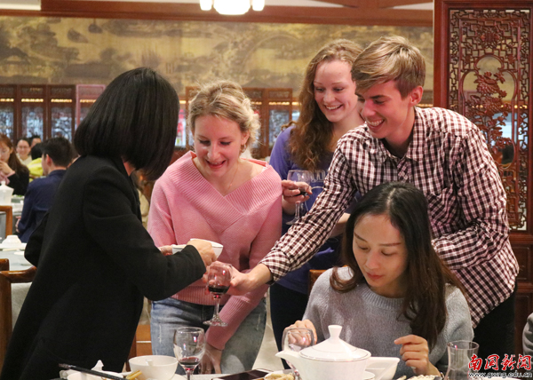 天微凉,美酒佳肴却是暖人。外教、留学生们虽来自不同国家,有着不同肤色、使用不同语言,但在此刻,在中餐厅这一方小小的餐桌上,却让异乡人都找到了家的感觉。