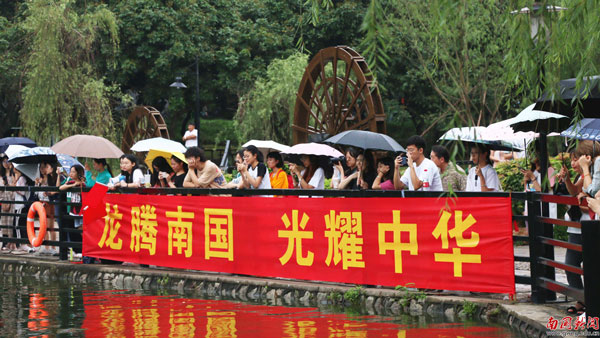 撑着伞也要看赛龙舟!(彭佩仪 摄)
