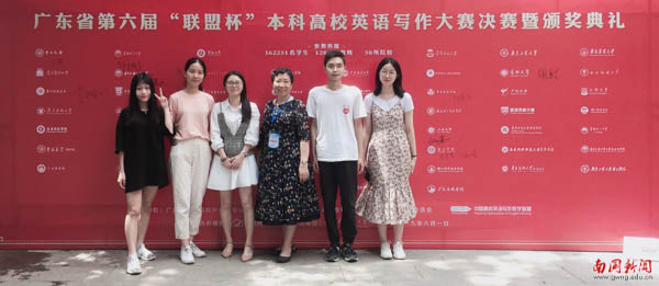 大英部张习群主任(右三)、英文学院指导老师谢真(左三)带队参赛