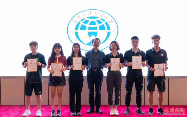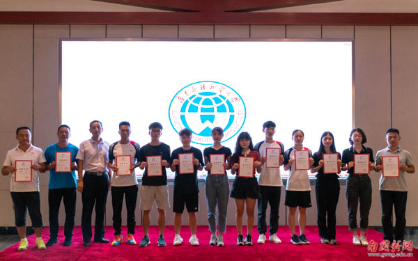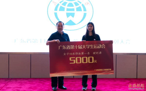党委书记黎冬宣读了获奖名单。大会对获奖运动员、获奖教练、获奖代表团进行了表彰。董事长丁小军代表学校为打破本次大运会记录的50米仰泳冠军韩凯韵同学颁发5000元奖金。