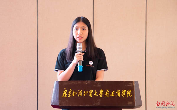 韩凯韵作为运动员代表发言。她代表全体运动员对学校领导和老师的大力支持表示感谢。回忆起赛前集训的日子,虽然紧张而忙碌,但队友间相互学习,互相督促,共同努力。融洽的团队氛围,让她既有进步的动力,又能够保持放松的心态。她希望同学们能在日常的生活和学习中依旧保持竞技状态,将体育精神与专业学习相结合,德智体美劳全面发展。