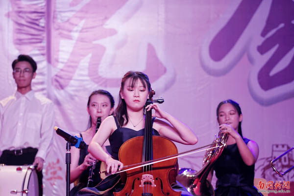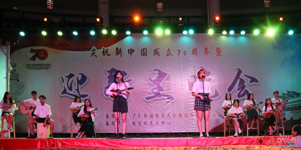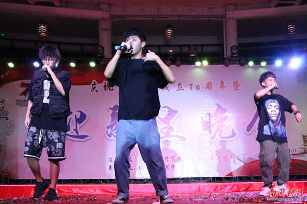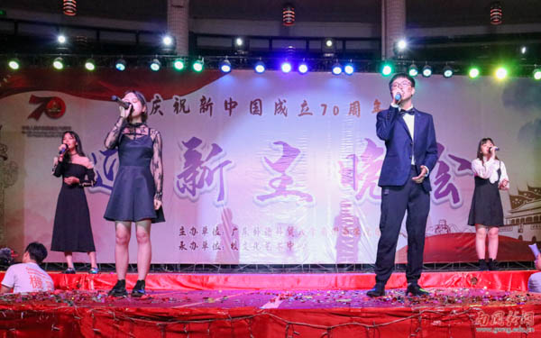 本网讯 9月19日晚,2019年迎新晚会在文化广场隆重举行。晚会以“耀日东升”“骄阳似火”“金熠生辉”三个篇章组成。党委书记黎冬、副校长王心洁与师生共同观看了晚会。