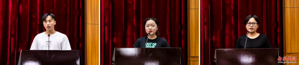 英语语言文化学院2017级学生肖汀、经济学院2016级学生谭嘉颖和中国语言文化学院2017级学生何燕青三位同学都曾参加过赴美带薪实习项目,收获满满。他们结合自己的经历,分享了“第一次坐飞机、第一次为自己做饭、第一次打工、第一次感受美国公司制度、第一次亲身体验异国文化……”等参加项目的生动感悟。