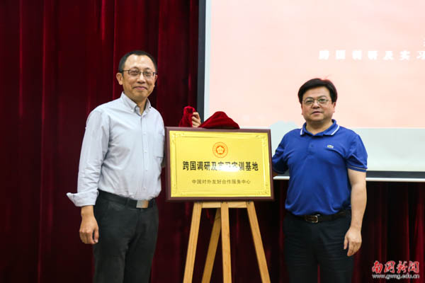 在全体与会人员的见证下,赖志立、王立新共同为广外南国与中国对外友好合作服务中心的“跨国调研及实习实训基地”揭牌。