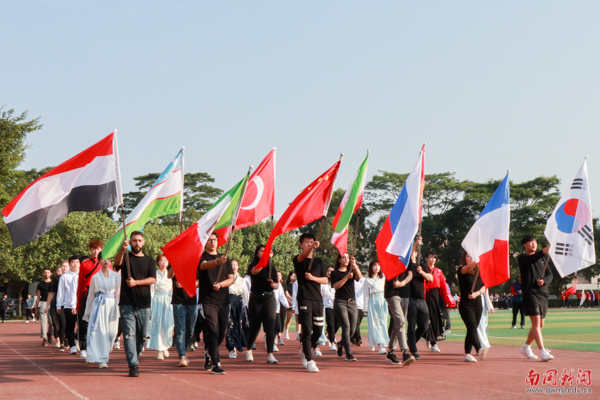 五彩斑斓的各国国旗迎风飘扬,国际学院方阵由中国学生和留学生组成。他们虽然肤色不同,发色不同,眼睛的颜色不同,但是相同的是笑容,是热情和活力。罗衣飘飘,舞转回红袖,“南国有佳人,轻盈绿腰舞”——中国学生身穿汉服展国粹,惊鸿一“舞”;《野狼dissco》的旋律配着动感的舞蹈,画风一转,是中国文化的兼容并包。留学生们一手彩绘着五星红旗,一掌涂鸦着自己国家的国旗,他们热情的舞蹈,是友谊的传递,是对构建人类命运共同体的呼应。