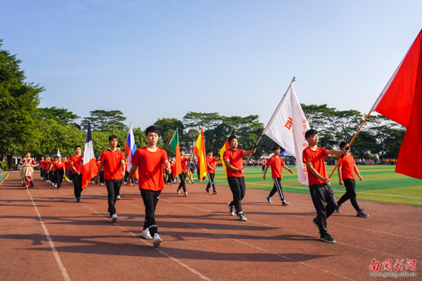 步伐铿锵,红旗飘扬。国旗护卫队英姿飒爽,迈着整齐划一的步伐,喊着“明德尚行、学贯中西”的校训,阔步走向主席台。他们目光坚定、气宇轩昂,展现出南国学子的沉稳坚韧。
