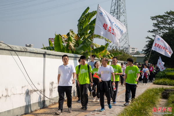 各部门工会队伍井然有序地跟随迎风飘扬的旗帜,向3.5公里校园健走道发起挑战。参赛队伍从运动场100米起点处出发,走过绿树成荫的校园小道,路过生机盎然的绿色生态基地,环校一圈又回到原点。一路上,参赛者们精神饱满,有说有笑,互相打趣。健步走队伍中的党委书记黎冬告诉记者,健步走项目在我校已成功举办了3年,得到了许多教授、老师与职工的认同和响应。黎冬认为,健步走既能锻炼身体,又能让参与者观赏学校美景,更有助于增进同事间的友谊。“你看,连外教也乐在其中!”,他看着身旁兴致勃勃的外教说道。