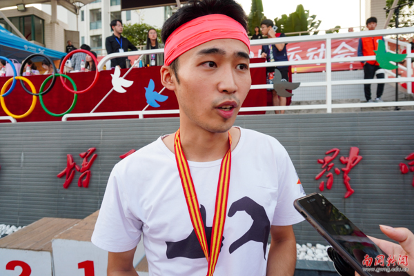 2016级投资学专业的黄卫同学摘得了男子5000米的桂冠,实现了个人的三连冠。在比赛中,凭借着自己独特的小技巧,结合呼吸调整步幅和频率,黄卫游刃有余地跑完了5000米,成功卫冕。在这12圈半的赛程中,陪跑员高举旗帜陪他跑完了一圈又一圈,令他十分感动。来自同学、老师的支持像无形的手护着他往前,护送他直登冠军的宝座。黄卫十分热爱长跑,早已养成了跑步的习惯,因此在比赛中他也不会感到特别吃力。今年读大四的他还告诉记者:“今年可能是我最后一次参加校运会,我是来突破自己的。”但由于刚参加了跳远比赛,身体未能得到恢复,他对自己的表现仍略感遗憾。