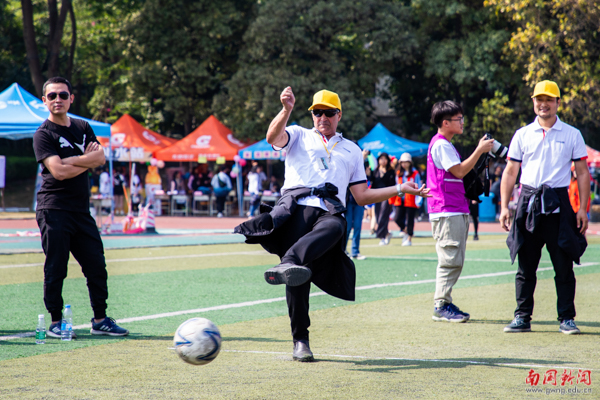 临近午时,阳光卷走寒意,平整的草地上立有两个小小的球门,教工组的趣味活动——鱼跃龙门马上开始。男女教职工分组轮番上阵,每人轮流踢三个球后累计分数,决出胜负。每一个球的射出,周围不断爆发出欢呼声,球擦着门框险入的悬念时刻重重上演,激动的尖叫此起彼伏。东语学院院长池圣女希望大家课余时间多多走出宿舍,放下手机,多多锻炼。