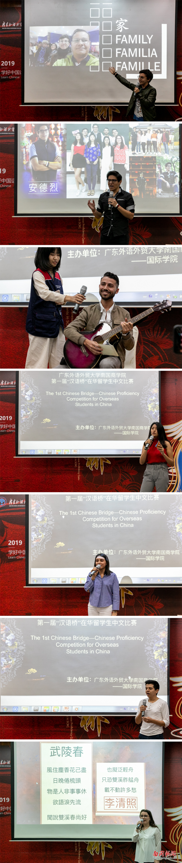 “红豆生南国,春来发几枝。”琴声如石上的清泉潺潺流出,墨西哥留学生大为用一首《相思》来表达自己对南国商学院的喜爱之情。安东尼奥同样来自墨西哥,他以自弹吉他配乐的方式朗诵了一首《静夜思》。在朗诵结束后,他还弹奏了一首来自家乡的乐曲表示浓郁的思乡之情。安东尼奥笑着告诉观众:学习中文最难克服的问题是口音,所以一开始,他会把所有的单词都改成了有趣的句子,让自己在练习发音时更加高效。