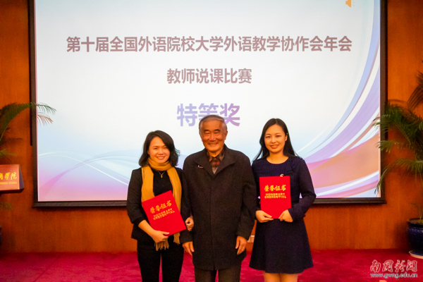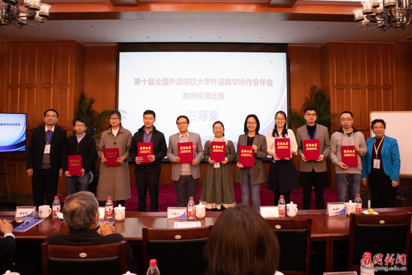 本网讯 12月7日,第十届全国外语院校大学外语教学协作会年会暨教师说课比赛在我校举行。我校大学英语教学部3名老师代表学校参赛,获得佳绩,其中王瑞英老师获特等奖,何梓健老师获一等奖,宋灿华老师获三等奖。