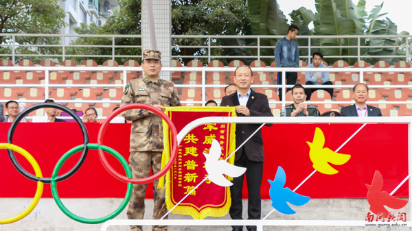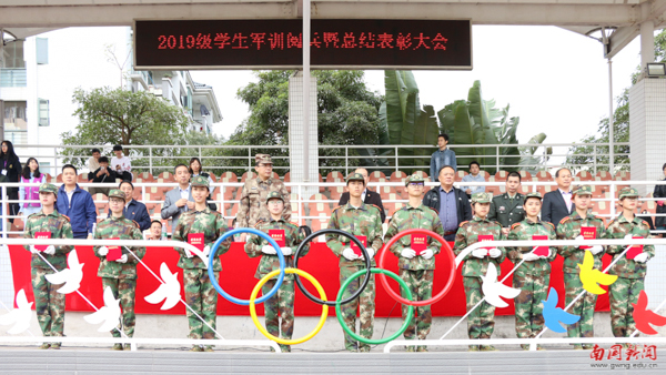 本网讯 1月8日上午,2019级学生军训阅兵暨总结大会在田径运动场举行。执行校长王华、党委书记黎冬、副校长杨永强、党委副书记付鸿信,越秀区人民武装部军事科科长王冯少校,越秀区人民武装部驻南国商学院军训负责人伍灶彪等出席大会,学校相关处室、各学院党总支负责人、全体教官、2019级辅导员与学生参加本次大会。本次大会由付鸿信主持。