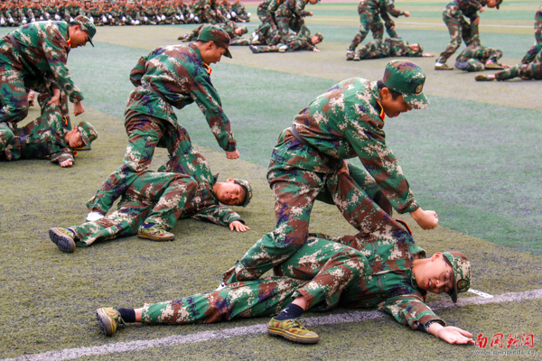 擒敌拳是由撤步、提拳、转头等一系列动作组合而成的一套拳术。在教官铿锵有力的命令下,数百人拳脚笔直,打着凛冽的拳风,一个个招式沉着有力,每个动作都精准到位,霸气十足的呼喝声在田径场内回荡。
