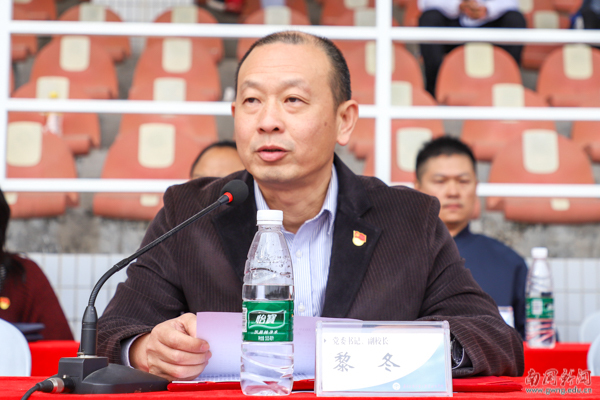 黎冬为军训作总结报告。“同学们在军训期间不畏辛苦、不畏寒风、不畏困难、互相帮助、相互鼓励,以教官为榜样,带着顽强的毅力和积极的心态出色地完成了全部任务。”黎冬充分肯定了同学们在军训期间的良好表现,他代表学校向各位教官和全体工作人员的辛苦付出致以崇高敬意和衷心的感谢,希望同学们以这次军训为起点,保持军人作风,树立远大理想,努力拼博、奋发进取,在学习生活中锻炼自己、塑造自己、提升自己,把自己打造成为祖国建设的栋梁之才。
