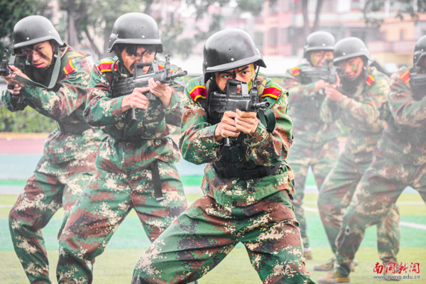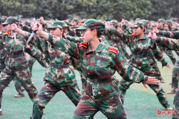 匕首操一出场即刻显示出傲人的气势,队员在教官的指挥下手持匕首,在震耳欲聋的呐喊声映衬下表演了八式匕首操。铿锵玫瑰英勇无畏,柔中带刚,慑人的气势与干练明快的招式,无一不在彰显着南国学子的热血风采。