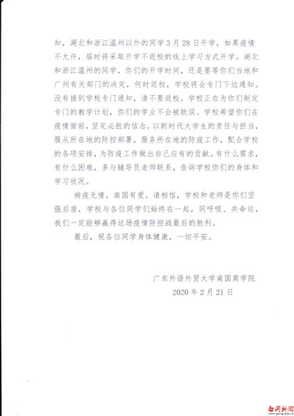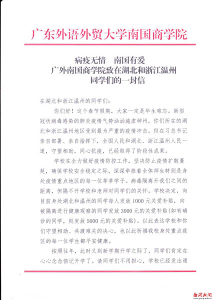 近日,《广外南国商学院致在湖北和浙江温州同学们的一封信》打动了南国师生的心。信中提到:“学校决定向目前身处湖北和温州的同学每人发放1000元关爱补贴,向被隔离进行健康观察的同学发放3000元的爱心补贴,向被确诊的同学发放5000元的爱心补贴。以此表达学校和你们守望相助、共渡难关的决心,也以此祈福我校身处重点疫区的每一位学生都平安健康。”