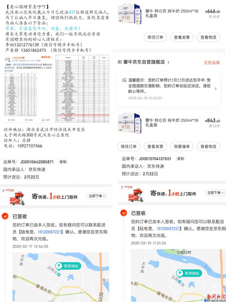 东语学院吴漪老师,是湖北孝感人。2月14日,当她在社交媒体平台上看到武汉亚心总医院的爱心捐赠紧急呼吁后,和6名湖北籍朋友成立亚心物资捐赠小组,为武汉亚心总医院捐赠特仑苏纯牛奶22箱。吴漪老师说,新冠肺炎发生以来,每天都积极关注疫情动向,看到自己的父亲每天都坚持在“抗”疫前线,自己在湖北老家隔离的同时,也希望能为家乡尽一点绵薄之力,希望新冠肺炎病人早日康复,希望大家的生活尽快恢复平静,也期待和自己的学生以及同事早日见面。