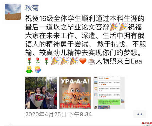“祝贺2016级全体学生顺利通过本科生涯的最后一道坎之毕业论文答辩。祝福大家在未来工作、深造、生活中拥有俄语人的精神勇于尝试、敢于挑战、不服输、较真劲儿精神去实现你们的梦想。”答辩结束后,西方语言文化学院俄语专业闫秋菊老师在朋友圈中写道,言语中饱含着对学生的关心与祝福。