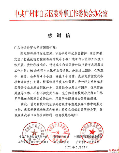 座谈会上,靳笛书记和胡述华主任对我校参与志愿服务的师生赞不绝口,希望与我校建立长期合作关系,在共建学生实践平台、学生实习实训等方面开展合作。随后,他们代表白云区委外事工作委员会、共青团广州市白云区委员会、中国国际贸易促进委员会广州市白云区委员会赠送感谢信,向我校师生在白云区涉外防疫青年志愿服务工作中的鼎力支持、无私奉献表达谢意。