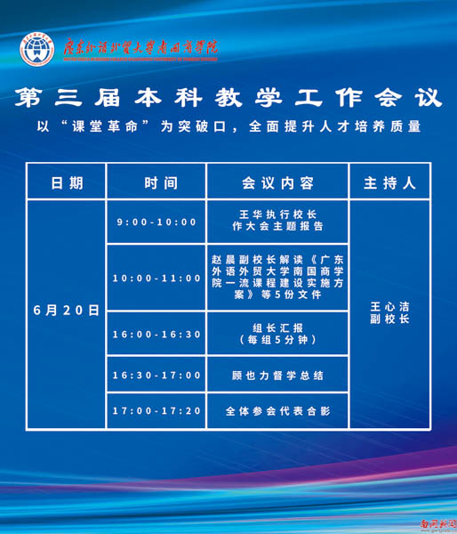 本网讯 为深入贯彻全国教育大会和新时代全国高等学校本科教育工作会议精神,进一步深化本科教育教学改革,学校将于6月20日,召开第三届本科教学工作会议。会议以“课堂革命”为突破口,全面提升人才培养质量为主题,强化内涵式发展,坚持以本为本,推进四个回归,全面提升人才质量。会议采取线下会议为主会场,线上直播为分会场相结合的形式召开。