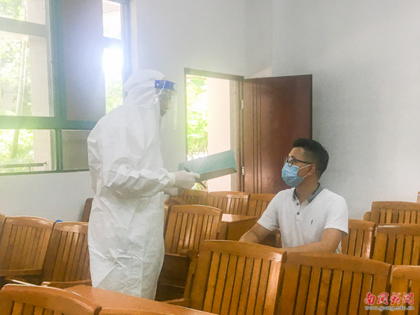 学生排队过程中,辅导员分别发现两名学生体温异常。辅导员将体温异常的女生(温岚扮演)和男生(冯钿扮演)分别带至临时休息室,并通知校医刘夕兵到场。校医刘夕兵对体温异常学生进行初步问询、排查,并安抚学生情绪。