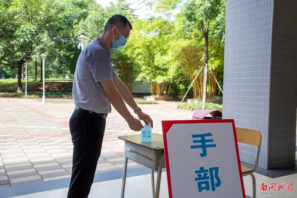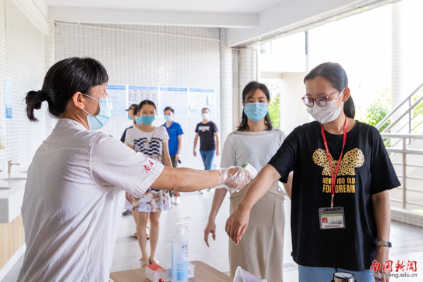 学生进入校园后,踩过消毒地垫,鞋底和行李箱轮子部位经过充分消毒。学生有序排队进入防疫检查通道,辅导员查验学生身份、检查穗康码并测量学生体温。学生领取防疫健康包并对手部进行消毒,健康包内装有一次性医用口罩、免洗洗手液和防疫健康小册子。