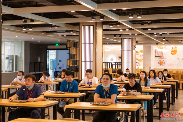 学生依次排队采用七步法洗手,食堂入口处工作人员测量就餐学生体温。学生排队踩过消毒地垫后进入取餐区。学生排队取餐,前后间隔1.5米,就餐时前后左右分别间隔一个位置同向就坐,就餐期间不允许交谈。饭堂安排值班人员到场管理。就餐完后,学生有序将餐具送到收集点,从饭堂出口处离开。