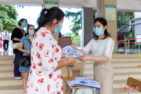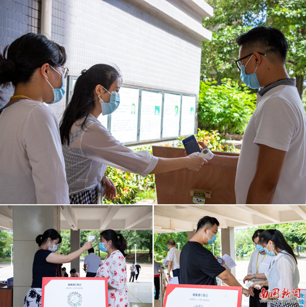 为自驾入校的学生测量体温、查验穗康码(谢丰 摄)